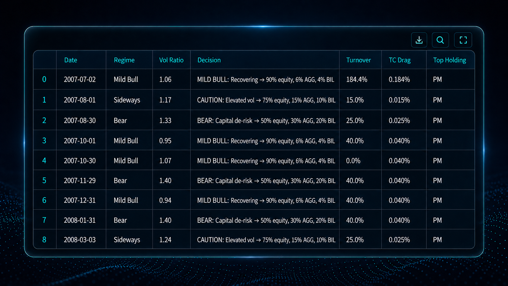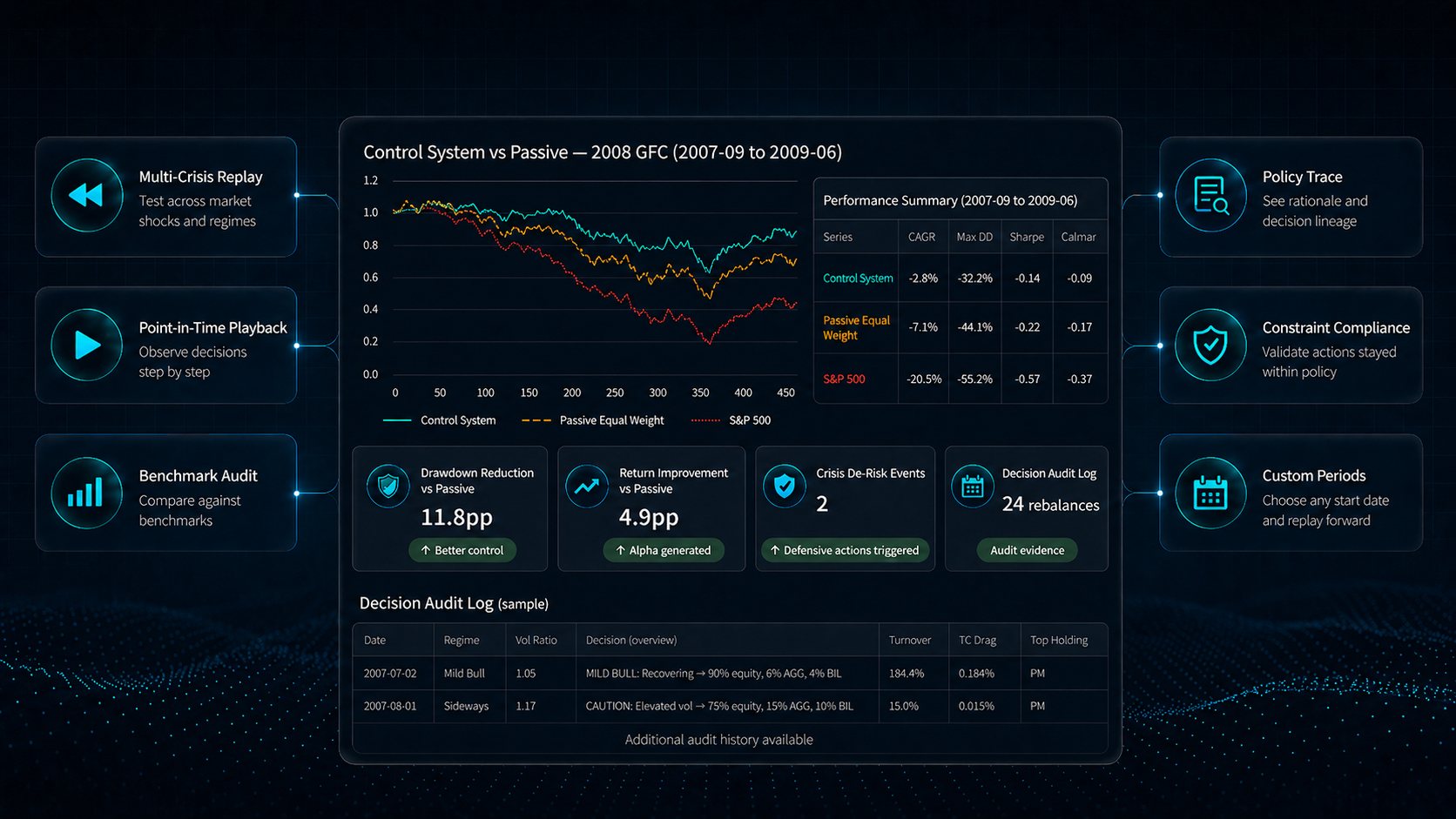 Performance Governance ControlOS is the evidence layer for adaptive investment control. It lets institutions go back in time, press play, and replay major crises, regime shifts, and custom periods through today using only point-in-time information.